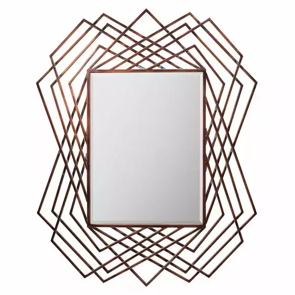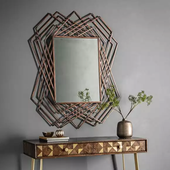 Featuring a striking mirror with a bold geometric frame in a burnished copper finish. The Alix Mirror will make a statement on any wall, while brightening and adding space to any room.