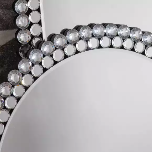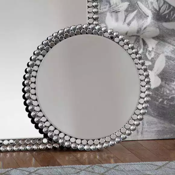 Introducing the elegant Elida Round Mirror, this flattering piece features a frame made from small mirrored circles and a modern bright silver finish.