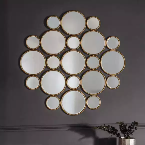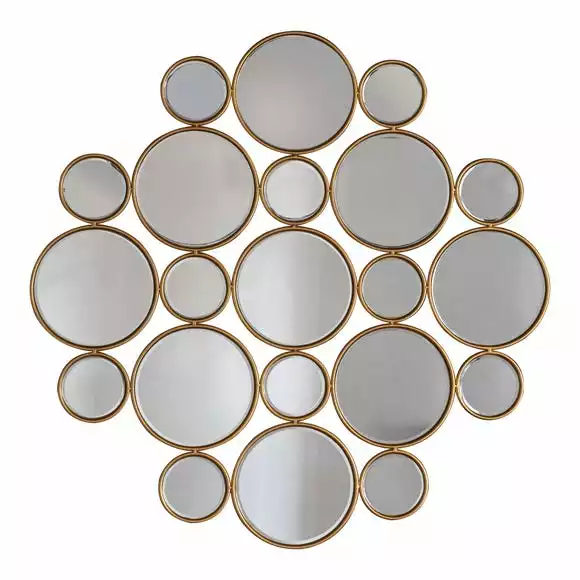 This beautiful multi circle design mirror will be a feature piece in your home. With a gold frame and saw-tooth hanging fixtures, this will be the finishing touch to your room.