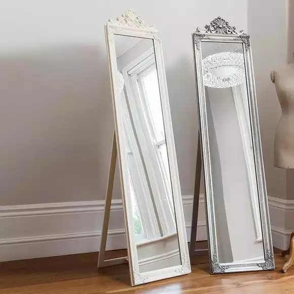 Bring a regal feel to your home with the Lalor Wood Cheval Mirror, a free standing cheval with a decorative crest and painted in a bright white finish, fit for a princess or queen.
