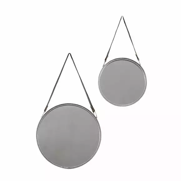 Bring this stylish Set of 2 Marlo Round Mirrors into your home for a coordinated and matching look. With metal frames, faux leather hanging straps and includes two different sizes, this contemporary pair will add a finishing touch to your living space or home office.