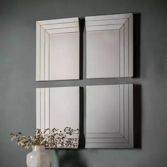 Create a contemporary statement with the Set of 4 Quoit Mirrors, with a spectacular bevelled glass design, these mirrors add light and style to any living space and create an eye-catching feature.