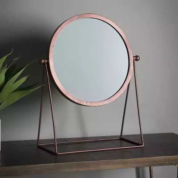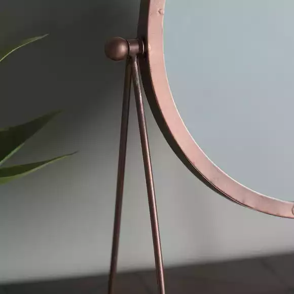 This contemporary table top mirror with adjustable angle is perfect for adding an industrial touch to your home. Finished with a copper frame, this round mirror is ideal as a final touch to any dressing table or console.